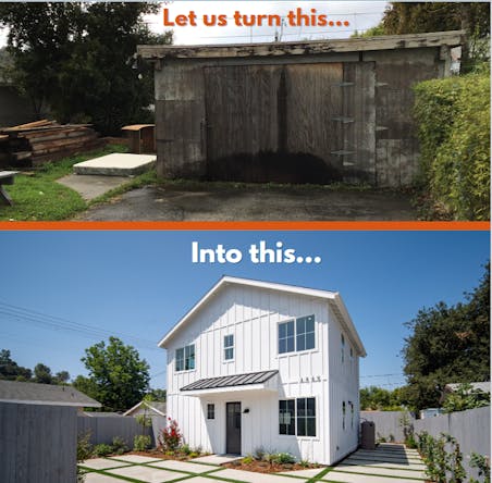 Detached ADU: We can build a brand new structure behind the primary residence that includes it's own bathroom, kitchen, lighting and plumbing. Perfect for rental income or moving in a parent or family member to provide privacy and comfort of being close by.Â